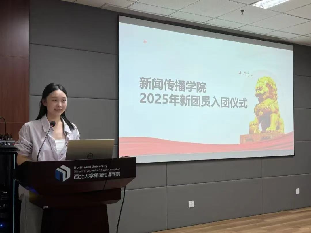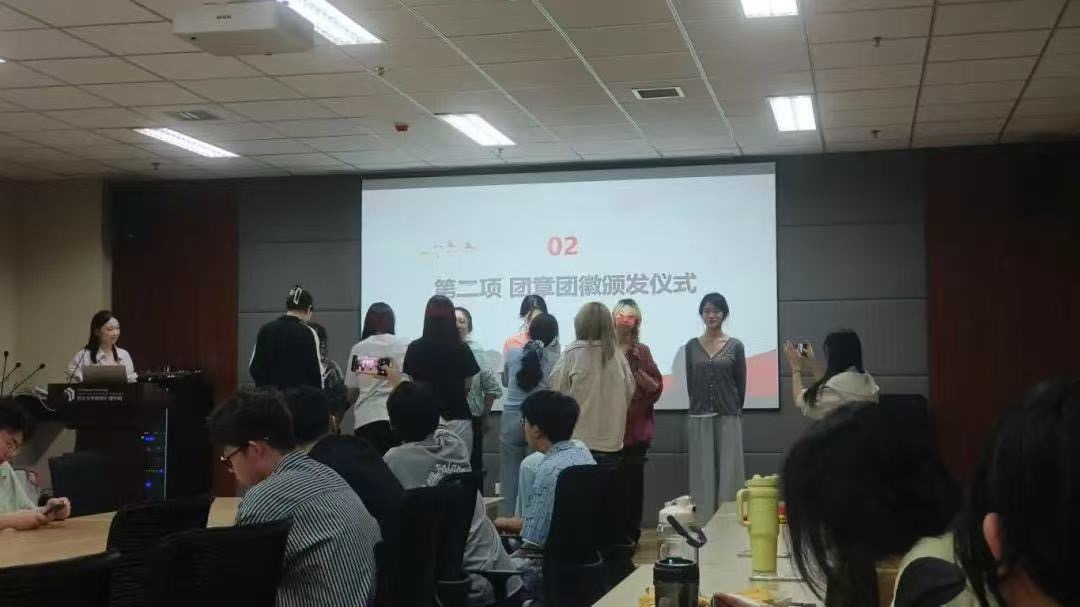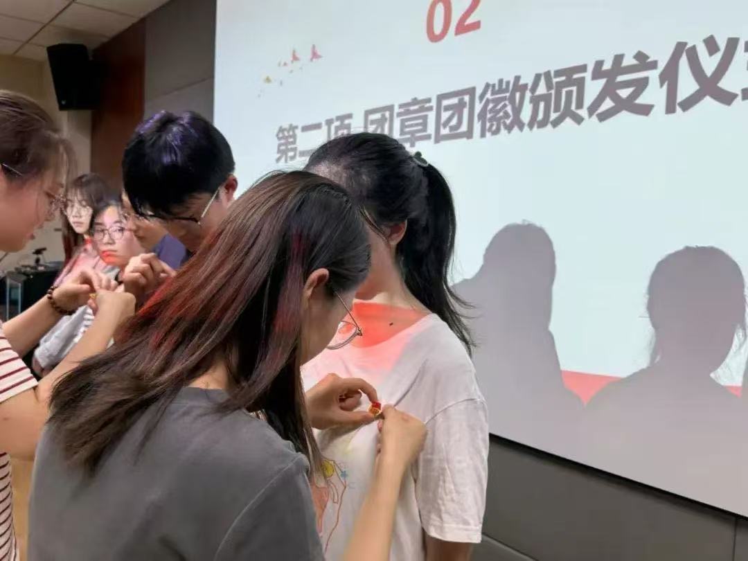 仪式开始,王恒老师宣读了新团员名单,一个个名字承载着青春的朝气与对共青团的向往。在团章团徽颁发环节,老团员代表怀着崇高敬意,将承载着光荣与使命的团章、团徽郑重授予新团员。熠熠生辉的团徽不仅是共青团员身份的象征,更凝聚着青年学子们的责任担当。