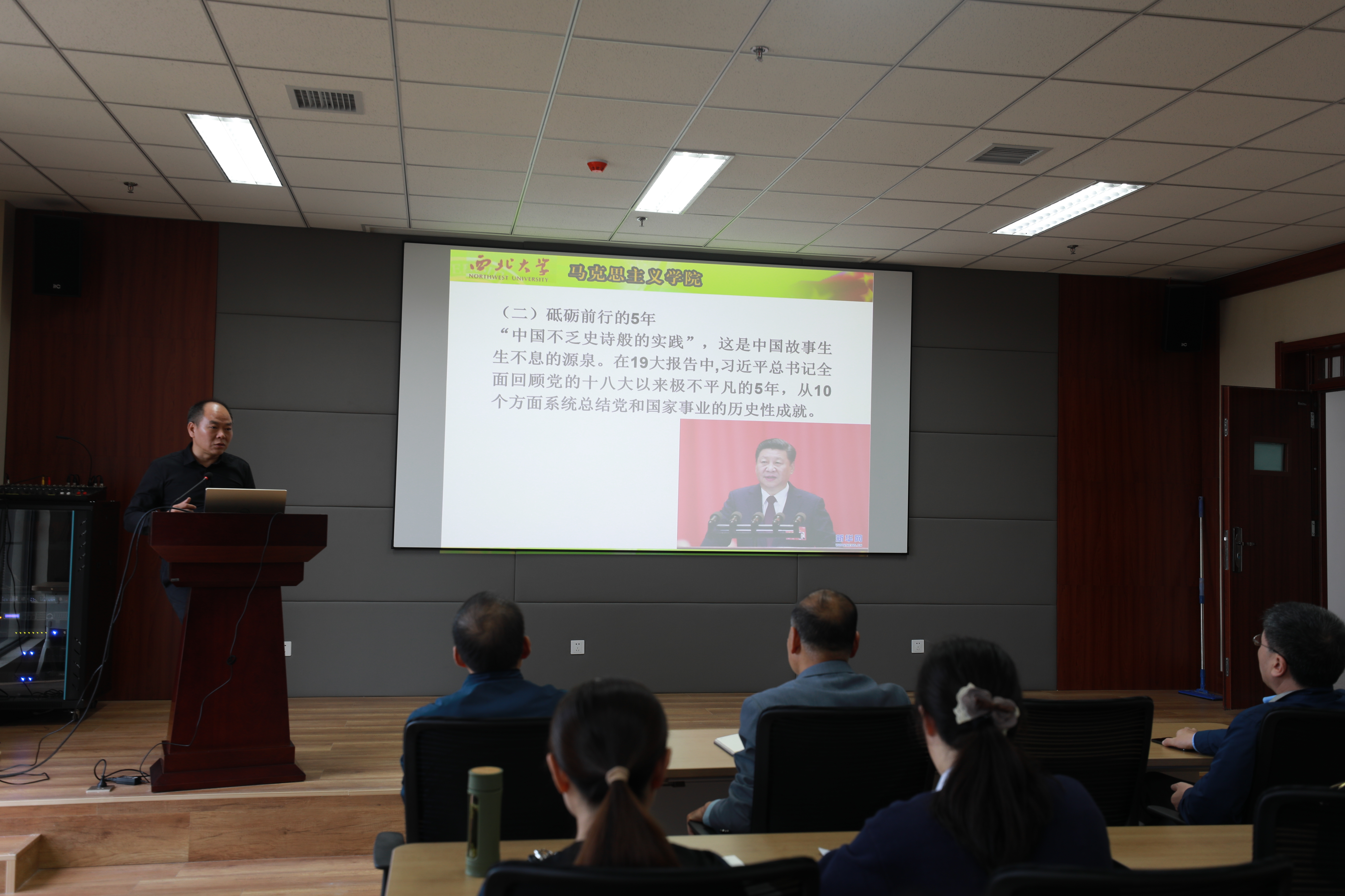王强采用叙事式教学法,以幽默风趣的语言、生动鲜活的事例,从讲好中国故事、构建中国理论、实现伟大梦想等三个方面,指出要争取和掌握话语权,力争讲话中国故事、陕西故事和西大故事,讲述了新中国成立七十年尤其是党的十八大以来,国家取得的巨大发展成就,阐释了习近平新时代中国特色社会主义思想的内涵和习近平总书记关于师德师风建设的重要论述,回顾了中国共产党人追求伟大梦想的艰辛探索和实现伟大梦想的必胜信心。