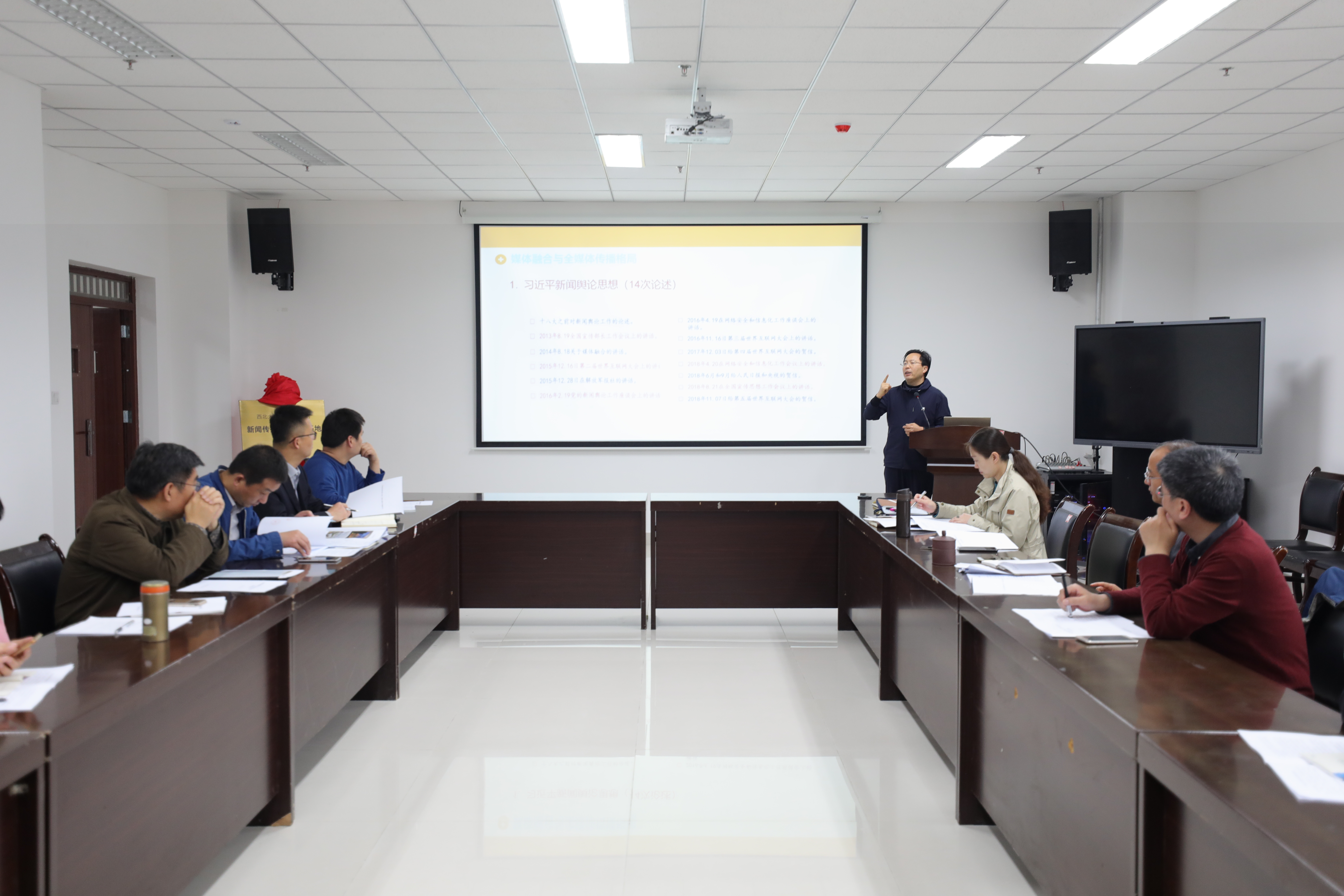 会议首先由公司副经理来向武副教授作了《媒体融合与全媒体的传播格局》的学习辅导。他从习近平总书记对媒体融合和全媒体格局的重要论述出发,分析了国内外媒体融合的现状,并对国内媒体融合进程的三个阶段、四种模式进行了阐释;针对推动媒体融合向纵深发展的问题,他以广州日报报业集团媒体融合为例子,展示了国内传媒界在构建全媒体传播格局、努力占领新的舆论场方面的有益探索。